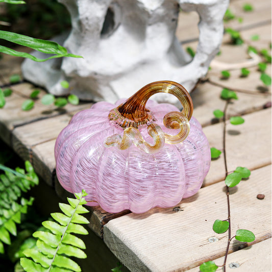 LONGWIN Hand Blown Glass Pink Pumpkin Figurines - 5.2 x 3.7 Inch Crystal Fake Pumpkin Home Decor Collectible Figurine for Tabletop/Halloween/Thanksgiving