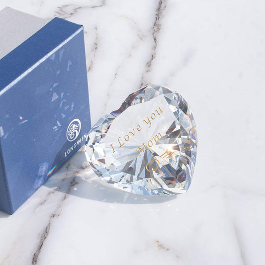 Crystal Heart Shaped Diamond Paperweight with "I Love You Mom"Engraved